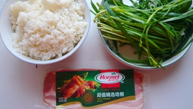原料:培根5片 韭菜100克 剩飯1碗 色拉油25克 鹽2克