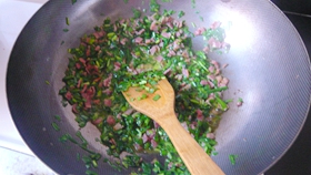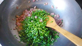 2.熱鍋涼油,先煸香培根。培根香味出來后再加人韭菜段。