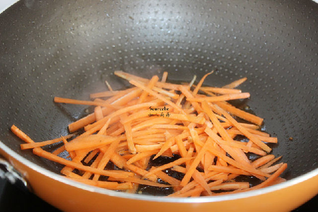 6.熱鍋,倒入橄欖油,炒胡蘿卜絲;