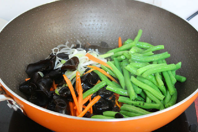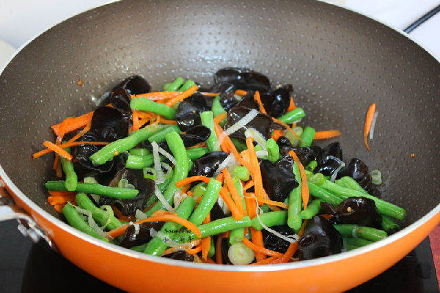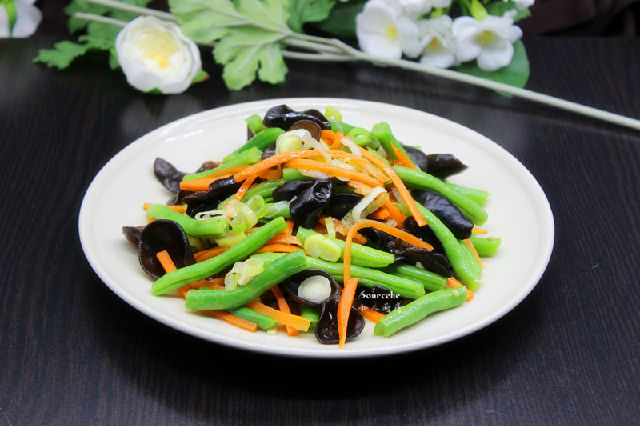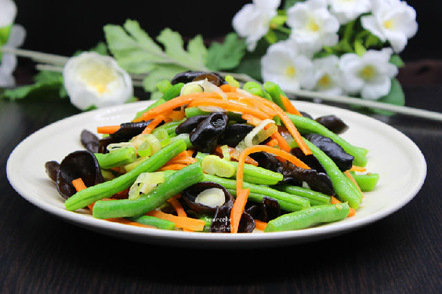 1.主食材:木耳20克、龍須豆300克、胡蘿卜50克、大蒜30克