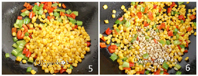 1. 清水泡一下甜玉米;紅綠椒清洗干凈;松仁備用。