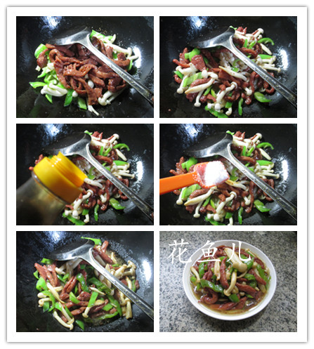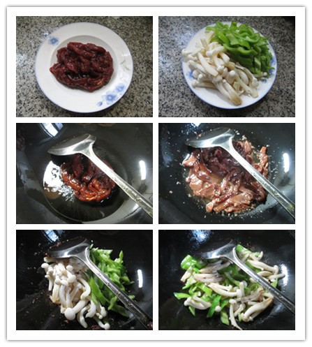 (2)接著,下入已清洗好的白玉菇和切好的尖椒翻炒翻炒。