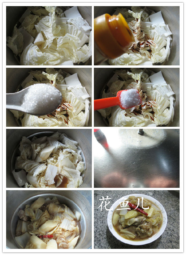 (3)接著,合入切好的鐵棍山藥和白菜,加適量的生抽、加適量的白糖、加適量的鹽調(diào)味翻勻。