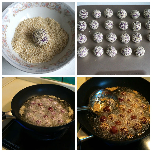 8. 炒鍋中倒適量的油,油溫?zé)?、9成熱時將紫薯球輕輕放入油鍋中,過10秒鐘再推動紫薯球;油溫一定要熱,否則芝麻容易掉。從圖中可以看到,我做的紫薯球有幾個就是掉芝麻很厲害了,就是油不是很熱時放進(jìn)去的;