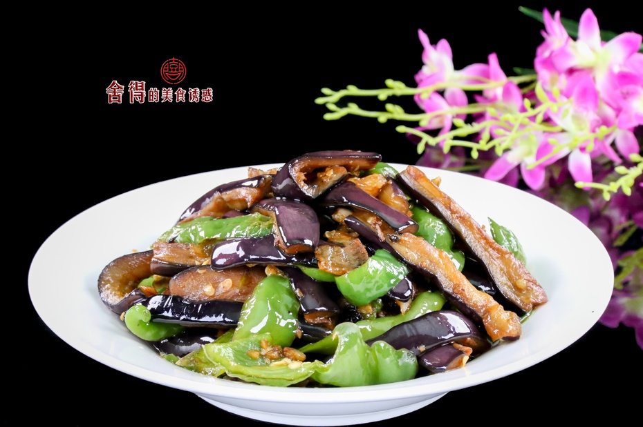 3、鍋燒熱,倒入肥肉,加適量的水把肉化開,水干后小火熬出豬油,倒入蒜蓉和豆豉,小火炒香,炒香后轉(zhuǎn)大火,倒入大青椒一起煸炒,青椒變色倒入茄子,腌過的茄子有鹽味,只加老抽即可,老抽用水化開可是顏色均勻,炒的時候沿鍋邊淋入少量的水,炒出的茄子色澤靚麗又不油膩,青椒變軟,加入適量的雞精翻炒均勻,即可起鍋。