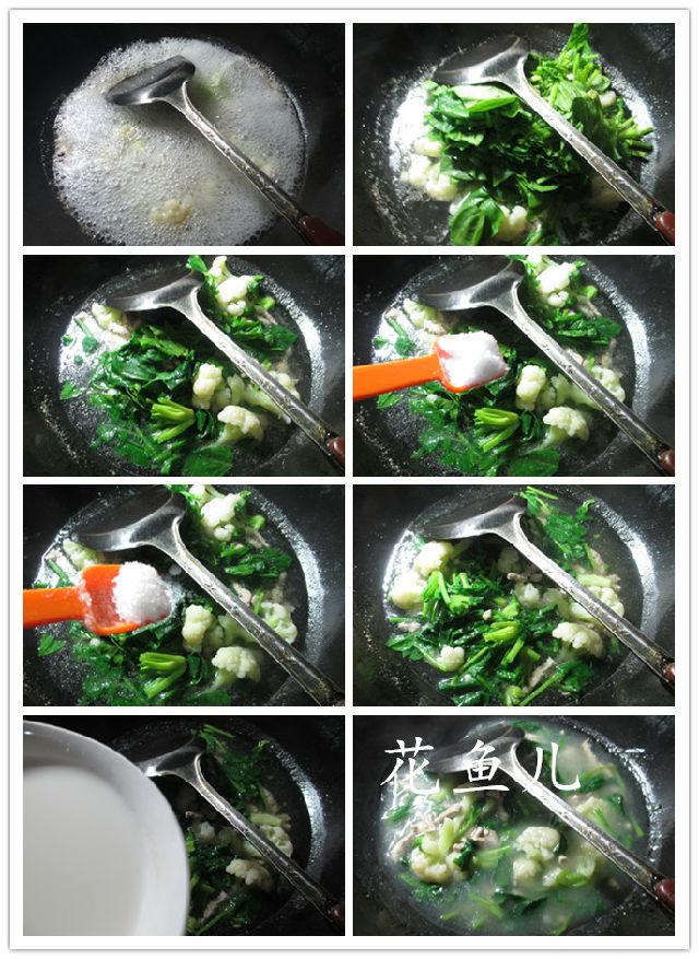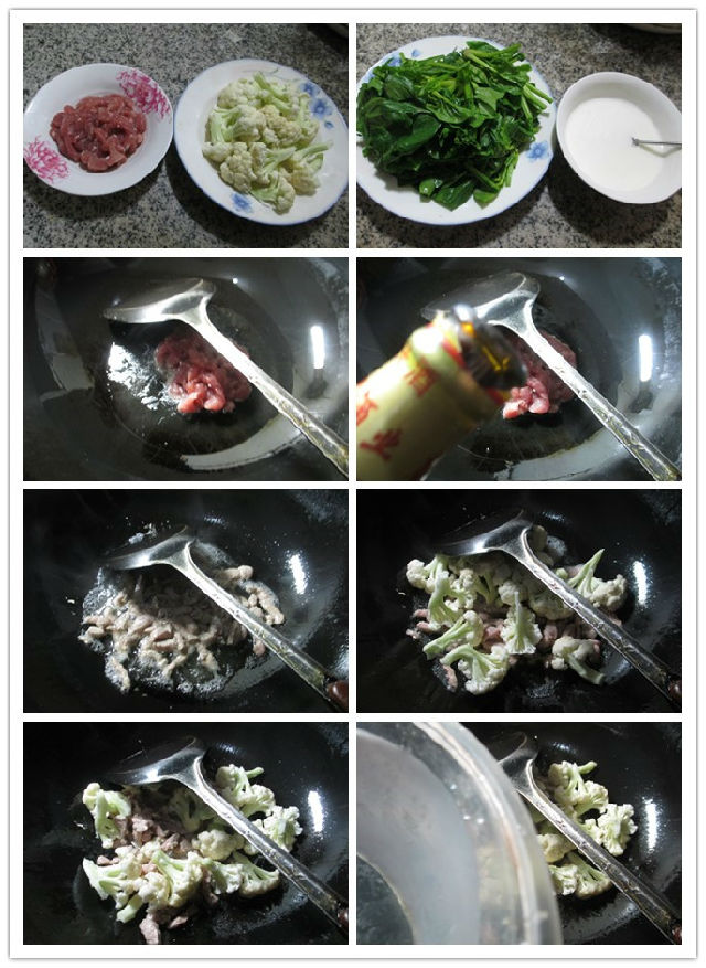 食材:里脊肉(已切)、花菜(已清洗)、菠菜(已洗凈切開)、水淀粉