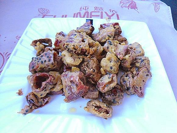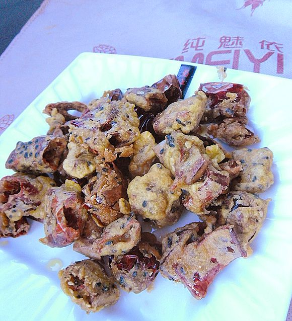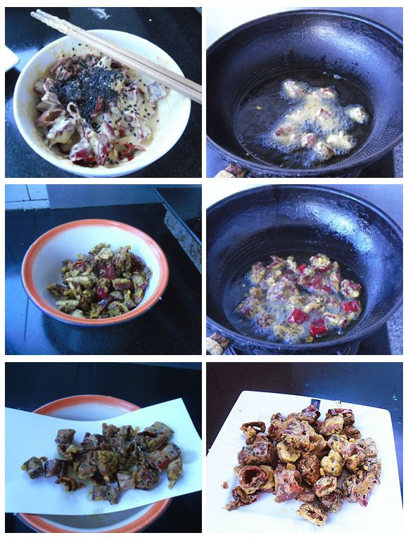 這是一道下酒佳肴,紅辣椒雖然很辣,但是經(jīng)過浸泡之后,辣味減輕了許多。裹上面糊炸制后,酥酥的口感有一絲絲的辣味,又含有黑芝麻的香味,味道非常不錯。