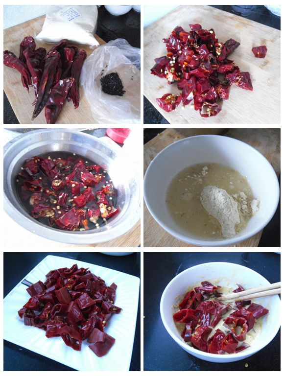 1、把干辣椒洗凈切段。
