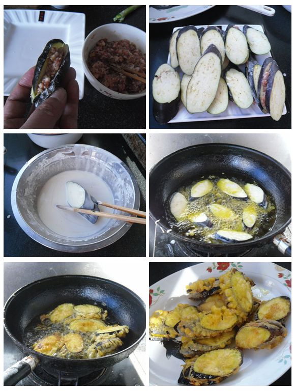 “炸茄盒”是一道傳統(tǒng)的菜肴,就是把茄子切成厚片,中間再切開不切斷,夾一些肉餡,蘸勻面糊后,炸制而成的一種食品。由此而衍生的還有“炸藕盒”,二者做法一樣,都是一款家常美味。