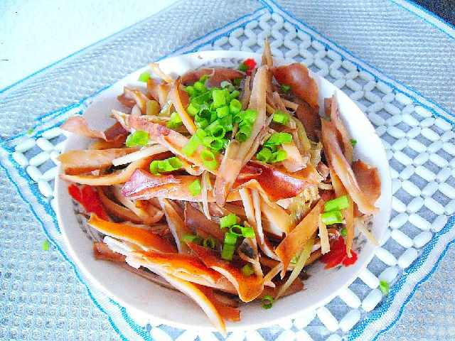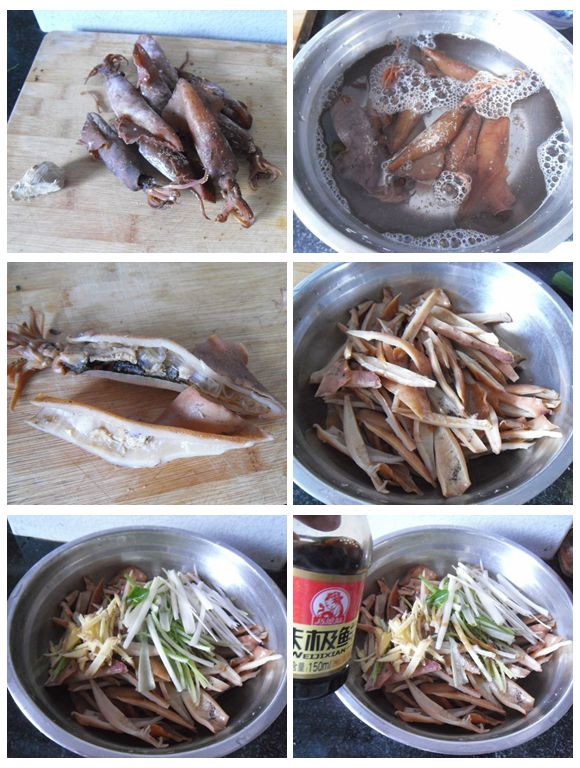 烏賊魚、墨斗魚都是這個(gè)家伙。還有的把冰鮮的叫海兔。實(shí)際冰鮮的味道很鮮美,和韭菜搭配非常好吃。今天做的是干品,所以采取了蒸制的方法。成品菜肴的味道一般,不如冰鮮的鮮美。