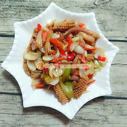 7.將焯過(guò)水的魷魚(yú)放入,大火爆炒二分鐘。
