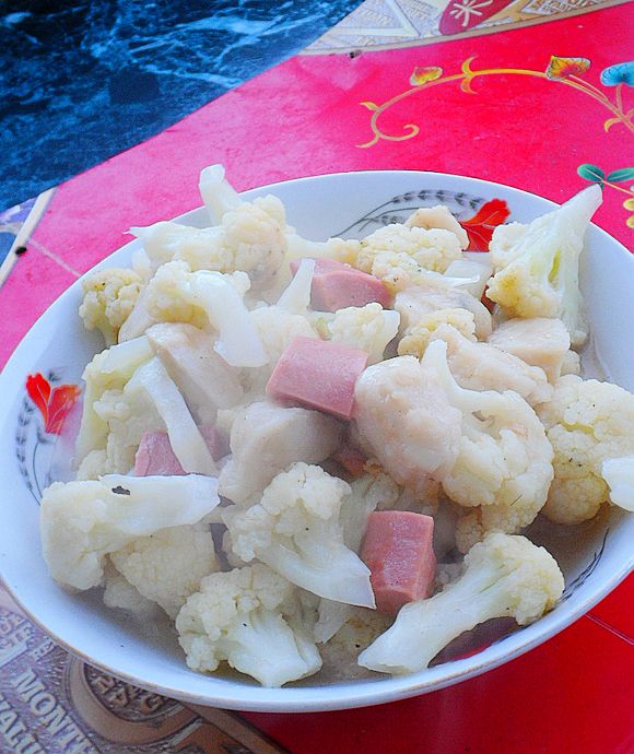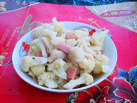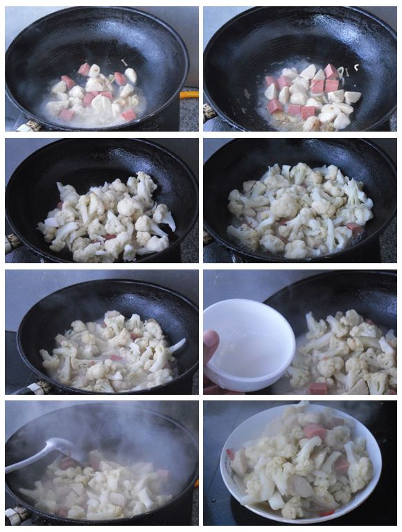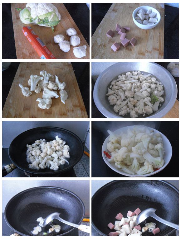 這是一道簡單快捷的家常菜肴,用菜花作為主料,也可以只用魚丸或者只用肉腸搭配,這完全取決于個人的喜歡和食材的方便。因為魚丸和肉腸易熟,所以制作時要把菜花提前汆燙至熟。