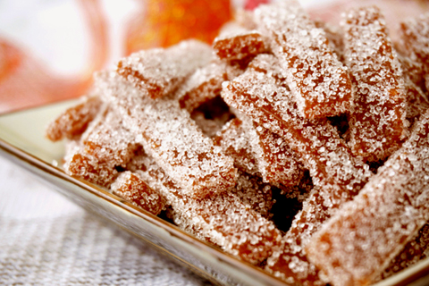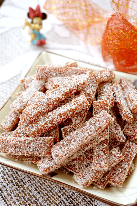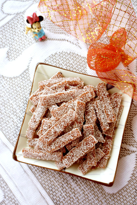 先前的山楂糕據(jù)說不夠甜,忽然就有了個新想法。記憶中,有一種山楂條/片上布滿了雪花般的砂糖,咬在嘴里咯吱咯吱。索性就把這山楂糕變成沾滿砂糖的山楂條。方法很簡單,山楂糕切片,放烤箱里烘干,然后在糖堆里滾上一圈??谖蹲兲鹆?,口感也豐富了。。。。
