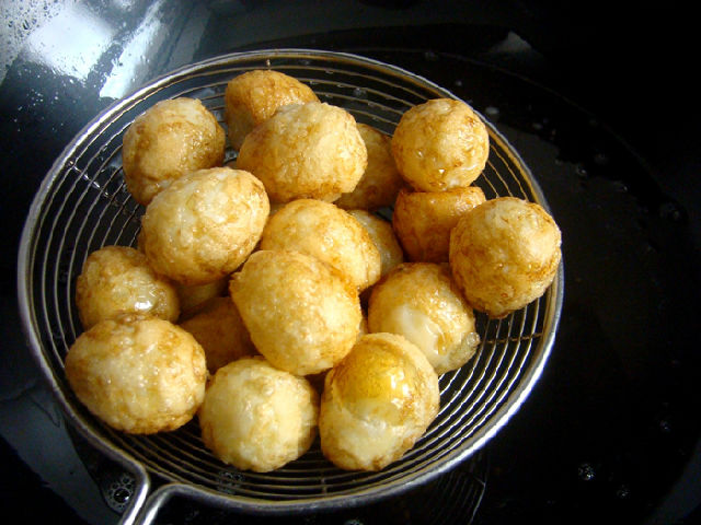 4,炸至金黃色時(shí)撈出瀝凈油。
