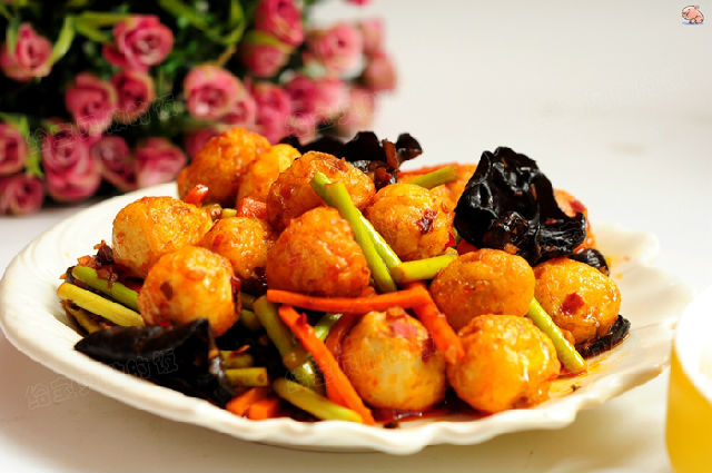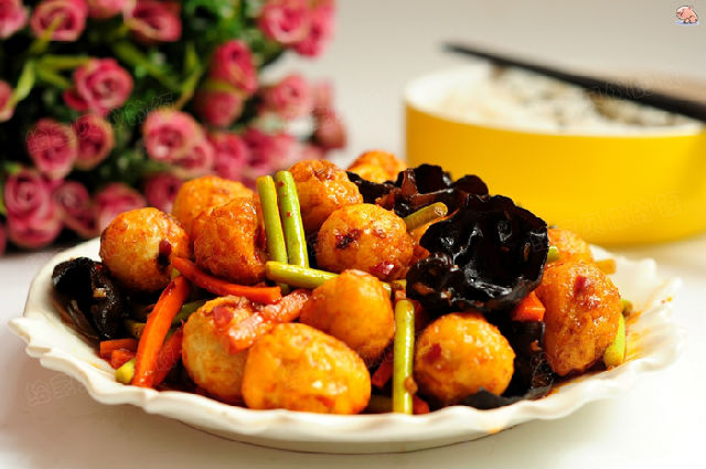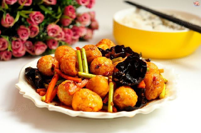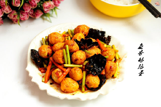 8,再倒入炸好的鵪鶉蛋翻炒均勻。