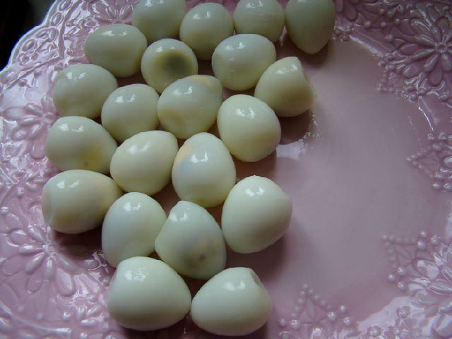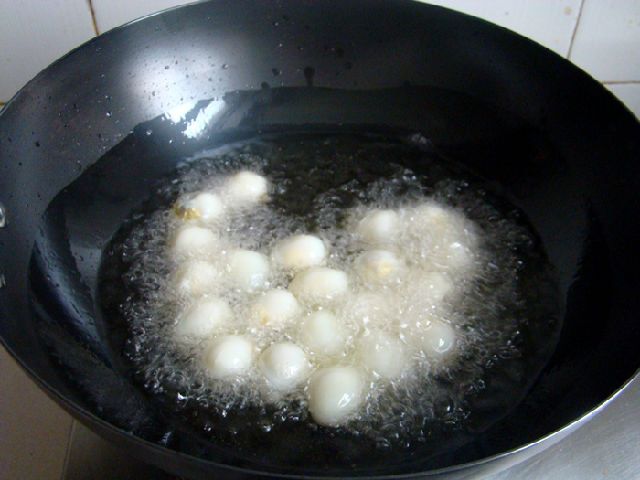 3,鍋放火上,添入適量油,6成熱時(shí)下入鵪鶉蛋。