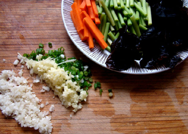 2,將蒜苔切寸段,黑木耳泡軟撕成塊,紅蘿卜改成與蒜苔差不多的細(xì)條,蔥姜蒜分別切末。