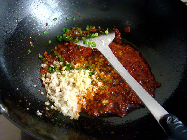 5,把鍋內(nèi)多余的油倒出,留少許底油,5成油溫時(shí)下入郫縣豆瓣醬煸出紅油,放入蔥姜蒜末炒出香味。