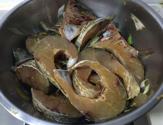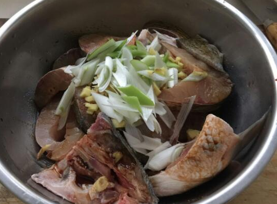 2.把魚放在容器里,切好的蔥、姜放上,準(zhǔn)備腌入味。