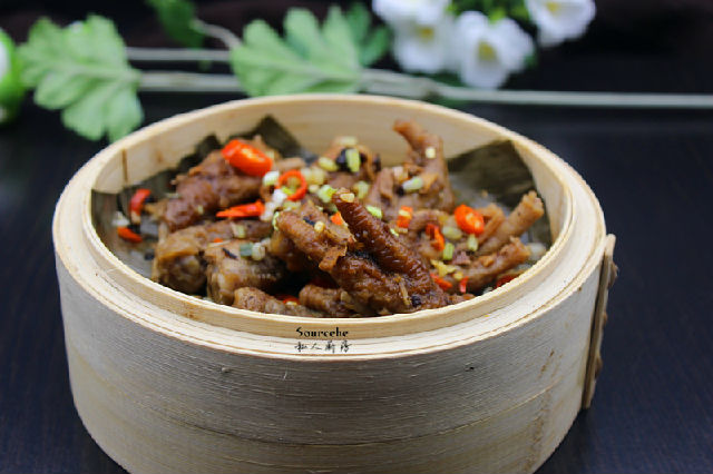 7.拌均好鳳爪放入蒸籠中;PS:蒸籠底可以墊上荷葉或粽子葉。