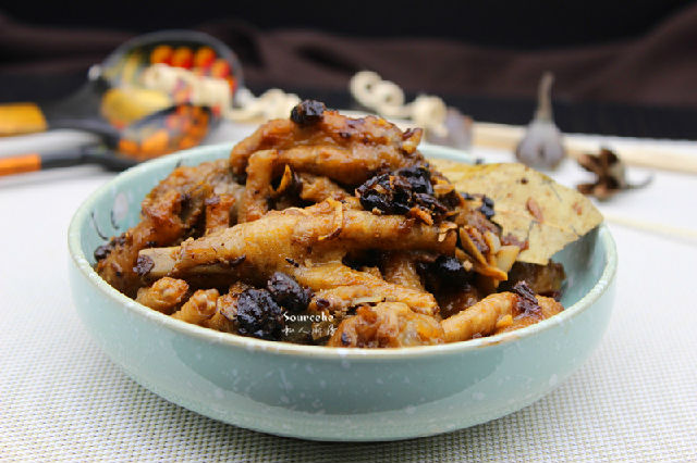 6.浸泡膨脹的雞爪,撈出瀝干水,放紅辣椒、蔥、蒜、豆豉、耗油5ml、生抽、料酒、生姜、鹽、油、八角、香葉拌均;