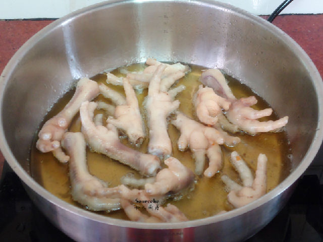 4.熱鍋,倒入適量的油,油溫?zé)崃?,倒入雞爪炸至微黃;PS:炸的時候記得蓋上蓋子,以防油濺出燙傷。