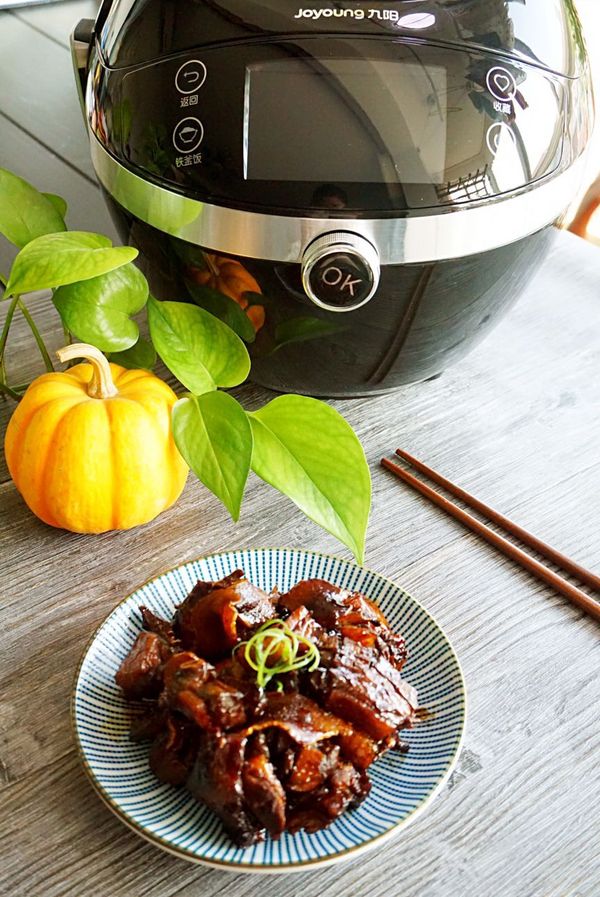 4、之所以說是快手菜,是因為有了九陽這款智能炒菜鍋,炒菜機變得輕松又省力。把煸好的老姜墊底,放入鴨肉,再加入適量的生抽和蠔油。加入一小把冰糖。