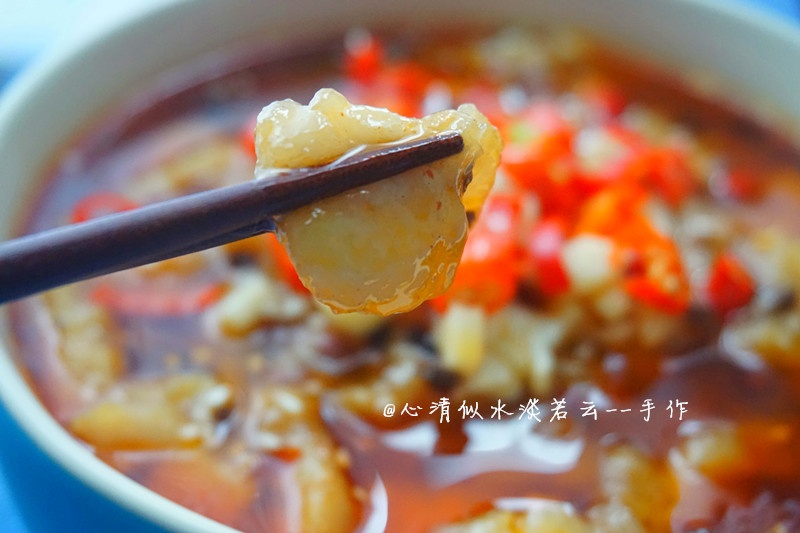 10.鍋中燒熱油,倒在尖椒和大蒜末上,次啦一聲 香味撲鼻而來