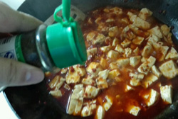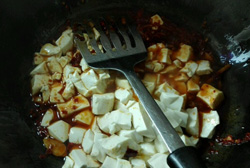 5、炒出紅油后放入豆腐