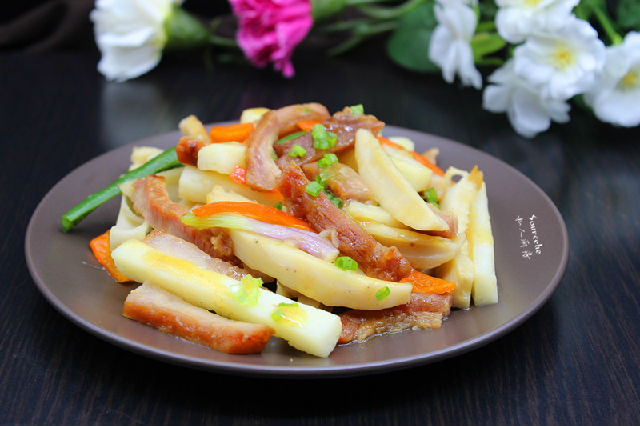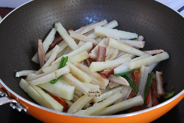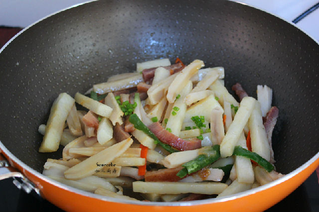 6.把瀝干水的山藥、蓮藕一起放入翻炒;