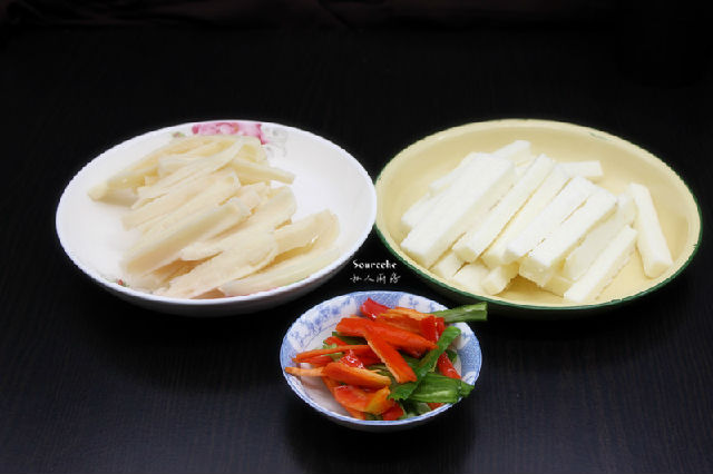 2.蓮藕去皮洗凈,切長(zhǎng)條,山藥同樣切大小和蓮藕一樣的長(zhǎng)條,紅辣椒青辣椒同樣切長(zhǎng)條;
