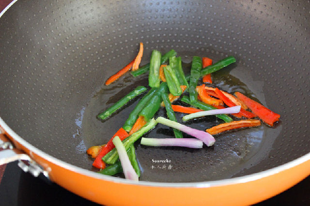 4.熱鍋,倒入橄欖油,放青辣椒、紅辣椒、蔥頭;PS:用甜辣椒,增味鮮甜。