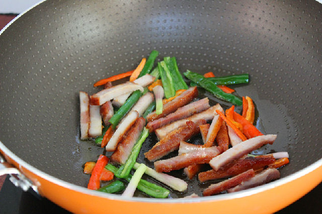 5.叉燒切長(zhǎng)條,加入鍋中翻炒;
