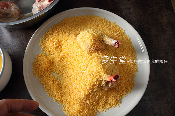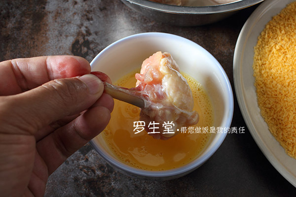 雞翅先蘸蛋液,然后再放進(jìn)面包糠中裹勻就成了,鍋中多倒油燒至四五成熱,