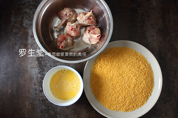 面包糠倒盤中,雞蛋在小碗中打散備用