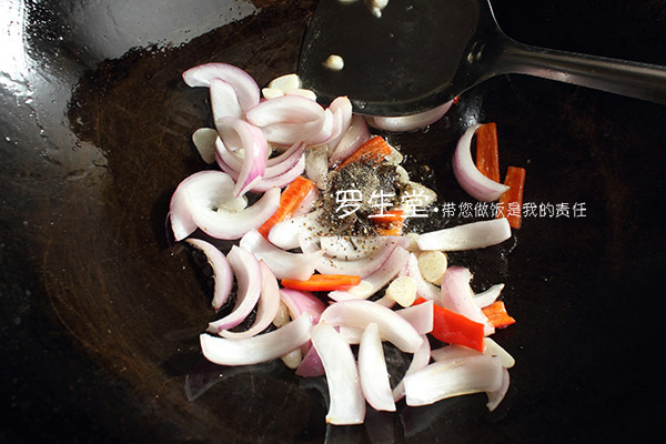 炒鍋洗凈,燒熱放少許油,下洋蔥,紅椒和蒜片爆一下,接著下黑胡椒碎煸出香氣約五秒鐘