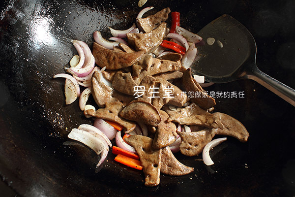 將豬肝倒進(jìn)鍋中大火翻炒幾下,讓材料炒勻,放紅酒爆香,再炒兩下,