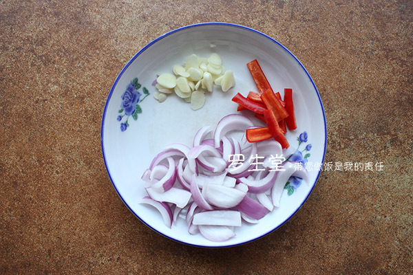 洋蔥和紅椒切粗條,蒜切片備用