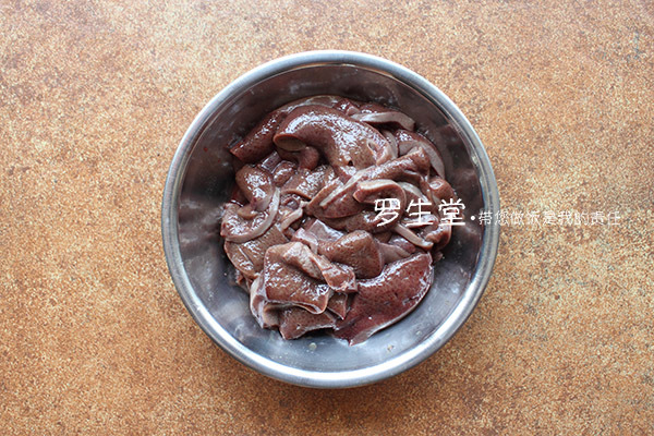 豬肝放清水中泡半小時(shí)去部分血水,切大約0.3公分厚的片備用