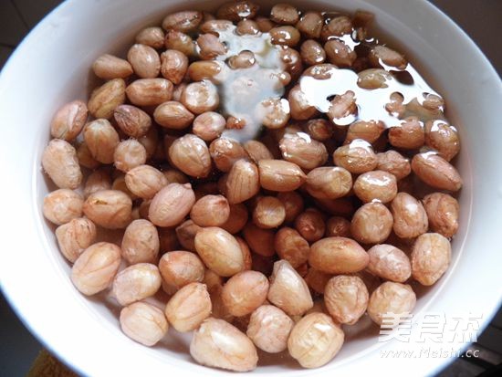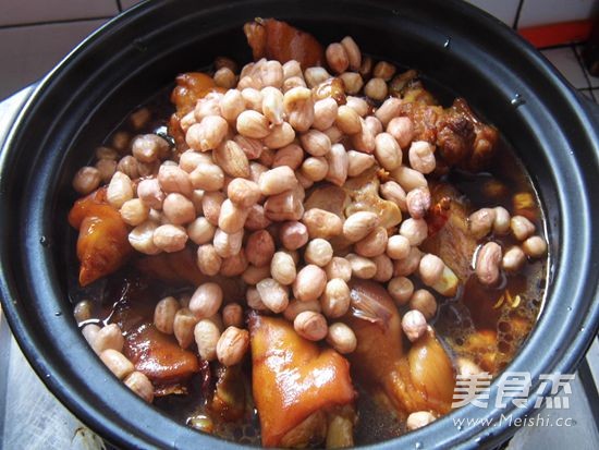 8.大火煮開后把豬蹄連湯帶水倒進(jìn)砂鍋,倒入提前泡好的花生,調(diào)入適量的鹽和料酒,用小火煮1小時30分,直到湯汁粘稠出鍋