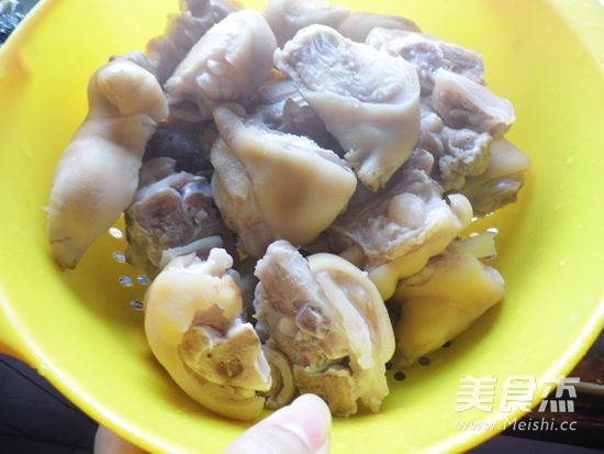 鍋里坐水,放入斬好的豬蹄段,大火煮開,煮5分鐘后撈出豬蹄段,晾涼后用清水洗凈備用
