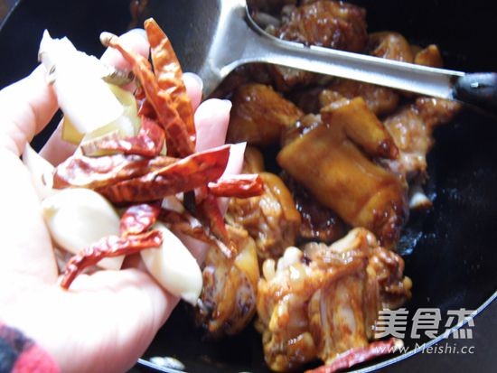 6.翻炒至每塊豬蹄都沾滿糖色,放入準(zhǔn)備好的辣椒段,大蔥段,姜片,蒜片,草果,八角,桂皮,香葉,花椒粒