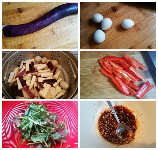 食材:紫色長茄1根、鵪鶉皮蛋4個、大紅椒半個、蒜瓣、生姜、香菜;