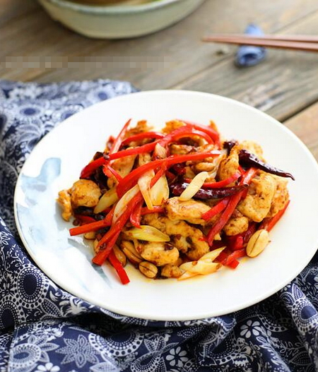主料:雞胸肉250克、紅椒2個、花生適量;