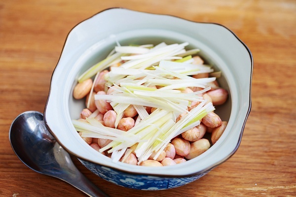 2、花生米灑上切好的蔥白絲。