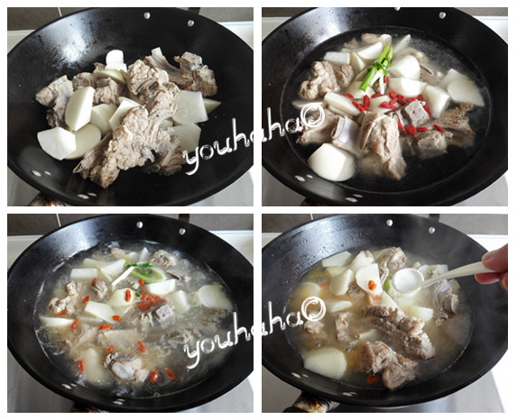 材料:白蘿卜700克,排骨500克,小蔥2棵,枸杞子少許,姜一小塊,植物油適量,鹽適量。