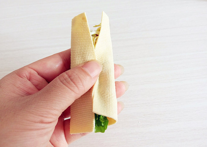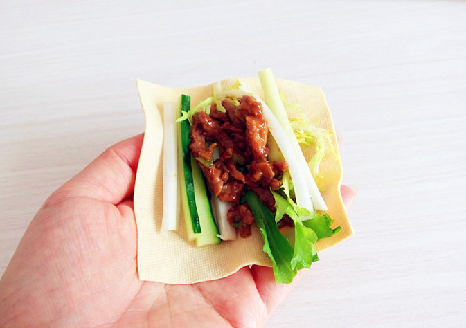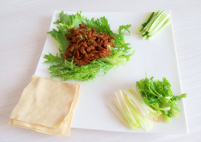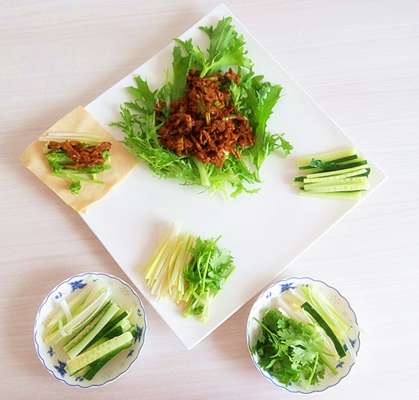 食材:精肉(最好選自里脊肉)、豆腐皮、黃瓜、黃豆醬、蔥、香菜、苦菊、花生油、蘋果醋、玉米淀粉