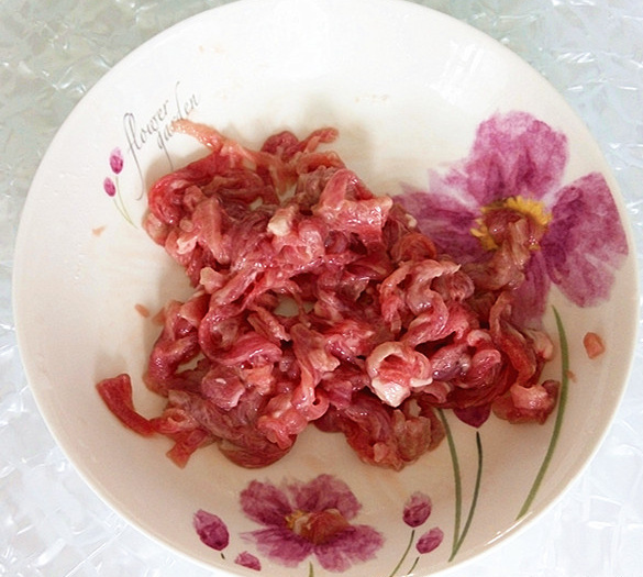 肉絲加蘋果醋(我用的是自己做的蘋果醋)、淀粉(小半勺)攪拌均勻浸味10分鐘。經(jīng)過這樣處理的肉絲炒出來又嫩又滑爽還特別香。