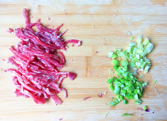 肉切絲、小蔥切小段。