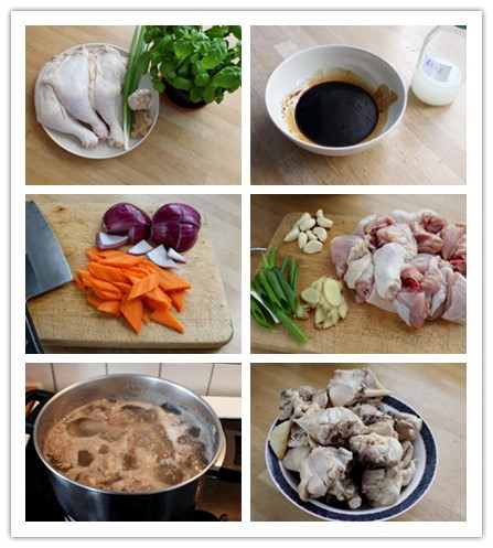 材料:雞腿3只(約)、小蔥2根、姜1塊(約20克)、蒜頭1個(gè)、九層塔盆栽1盆(約使用20克葉子)、紅皮洋蔥1個(gè)(約200克)、胡蘿卜1個(gè)(約100克)